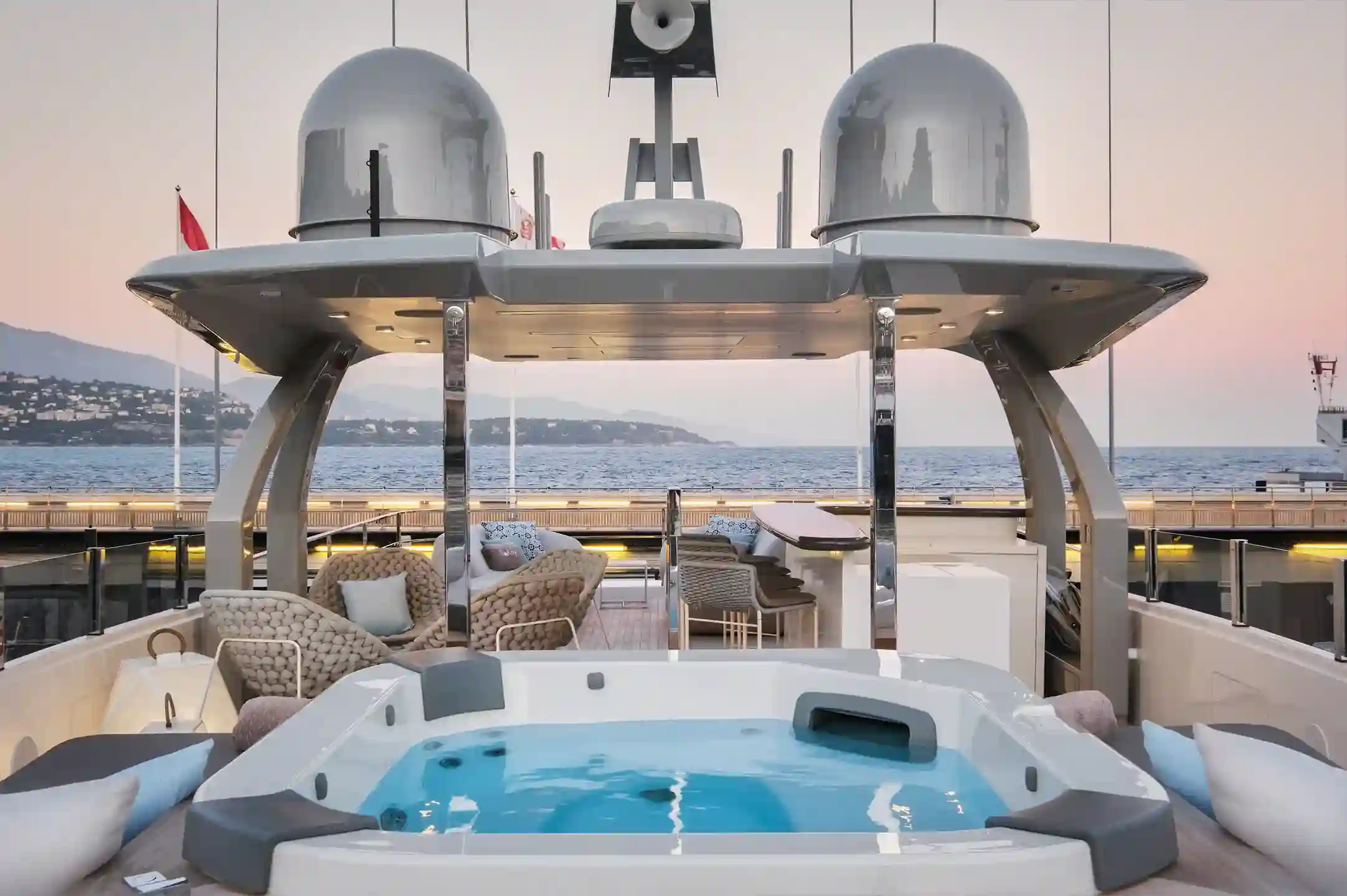 À l’extérieur, les différents ponts invitent à profiter pleinement de la mer : salon panoramique à l’avant pour admirer les paysages, grande table pour les repas en plein air et sundeck avec bar et jacuzzi pour prolonger les journées jusqu’au coucher du soleil. Chaque espace a été pensé pour offrir une expérience de croisière élégante et immersive, où confort et convivialité se mêlent naturellement.